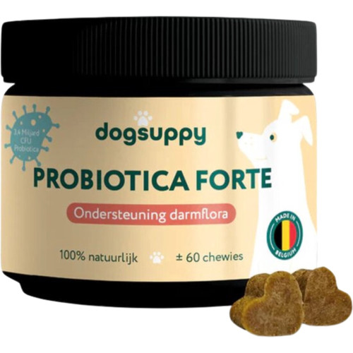DogSuppy Probiotica Forte is een 100% natuurlijk supplement met meer dan 3 miljard probiotica per snoepje voor een gezonde darmflora en een blije, actieve hond. Deze smakelijke hartvormige snoepjes ondersteunen de spijsvertering, verbeteren de stoelgang en dragen bij aan de algehele gezondheid.