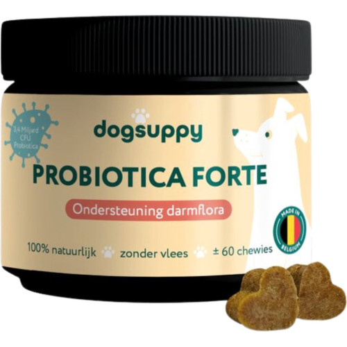 DogSuppy Probiotica Forte is een 100% natuurlijk supplement met meer dan 3 miljard probiotica per snoepje voor een gezonde darmflora en een blije, actieve hond. Deze smakelijke hartvormige snoepjes ondersteunen de spijsvertering, verbeteren de stoelgang en dragen bij aan de algehele gezondheid.