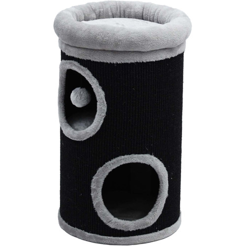Deze krabton is de ideale combinatie tussen een krabgelegenheid en een slaapplaats. Dit product is namelijk voorzien van maar liefst 3 slaapplekken. 2 gaten waar uw kat zich heerlijk in kan terug trekken voor wat extra privacy en een slaapplaats bovenop de krabton, die ook nog eens voorzien is van een ultrazachte comfortabele pluche rand, die zorgt voor extra comfort tijdens het welverdiende uitrustmoment. De met sisal bekleedde buitenzijde van dit product geeft uw kat voldoende gelegenheid zijn of haar nagels te scherpen om zo zijn natuurlijke krab behoefte te stimuleren. Een van de slaapplaatsen is ook voorzien van een balletje met elastiek, waar uw kat naar hartenlust mee kan spelen. Wordt geleverd in de afmeting 66x38x38cm in de kleuren zwart / grijs.