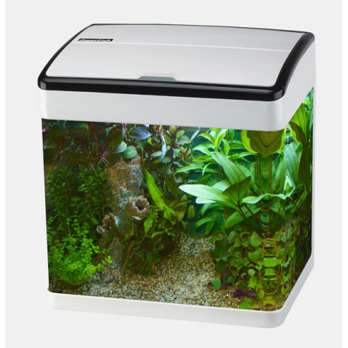 Nieuwe aquarium met gebogen glas, wat zorgt voor een panoramisch effect. Het aquarium heeft een topfilter met een grote biologische filtercapaciteit. Eenvoudig in onderhoud en geschikt voor zowel de beginnende als de meer ervarende aquariumliefhebber. Het filter is gemakkelijk schoon te houden met een vervangbare filtercassette met CrystalClear. De bijgeleverde pomp en waterdichte (IPX8) en veilige LED-verlichting passen perfect in het filterplateau. De LED-verlichting kunt u bedienen met een timer (niet inbegrepen). Achterwandposter is bijgeleverd.