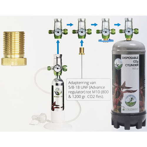 Met de Colombo CO2 Adapter kun je de drukregelaar van de Colombo CO2 Advance set gebruiken op zowel de Colombo CO2 Drukcilinder van 800 gram als die van 1200 gram. Dit vermindert de frequentie van het verwisselen van cilinders en maakt het gebruik van CO2 kosteneffectiever. De adapter heeft een verloop van 8/8-18 UNF naar M10x1.