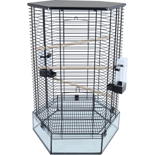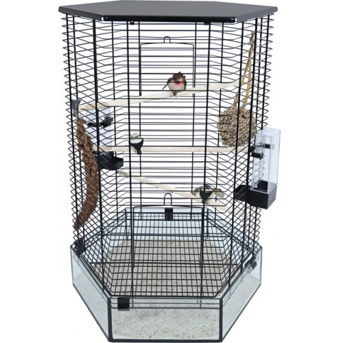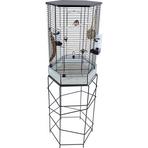 Interzoo vogelkooi Vision hexa zwart is een unieke vogelkooi door de achtkantige vorm, maar vooral door de glazen achtkantige onderbak. Voor deze kooi is een draadkooistandaard leverbaar.