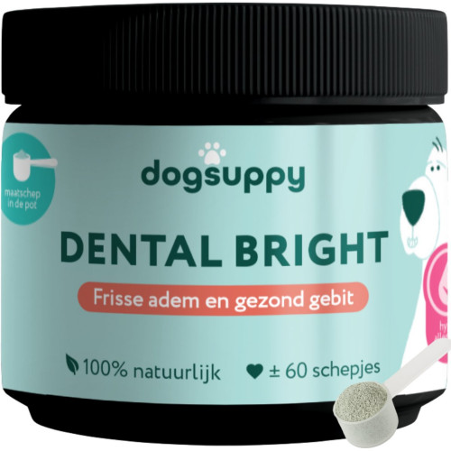 Het Dental Bright poeder bevat bruine algen, die ervoor zorgen dat je hond meer speeksel aanmaakt. Speeksel is essentieel voor een goede mondhygiëne, omdat het voedselresten wegspoelt en ongewenste bacteriën helpt verminderen. Dit ondersteunt het verminderen van tandplak. Bovendien bevat elke schep ongeveer 1 miljard goede bacteriën (pre- en probiotica) die bijdragen aan het evenwicht van bacteriën in de mond van je hond. Dit resulteert in minder tandplak, een frissere adem en een gezonder gebit. Natuurlijke ingrediënten zoals pepermunt en eucalyptus zorgen daarbij voor een extra frisse adem.